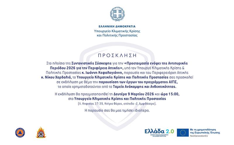 Στο πλαίσιο της Συντονιστικής Σύσκεψης για την «Προετοιμασία ενόψει της Αντιπυρικής Περιόδου 2026 για την Περιφέρεια Αττικής», υπό τον Υπουργό Κλιματικής Κρίσης & Πολιτικής Προστασίας κ. Ιωάννη Κεφαλογιάννη, παρουσία και του Περιφερειάρχη Αττικής κ. Νίκου Χαρδαλιά, το Υπουργείο Κλιματικής Κρίσης και Πολιτικής Προστασίας σας προσκαλεί σε εκδήλωση με θέμα την παρουσίαση των έργων του προγράμματος ΑΙΓΙΣ, τα οποία χρηματοδοτούνται από το Ταμείο Ανάκαμψης και Ανθεκτικότητας.